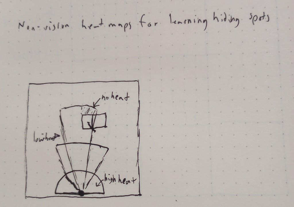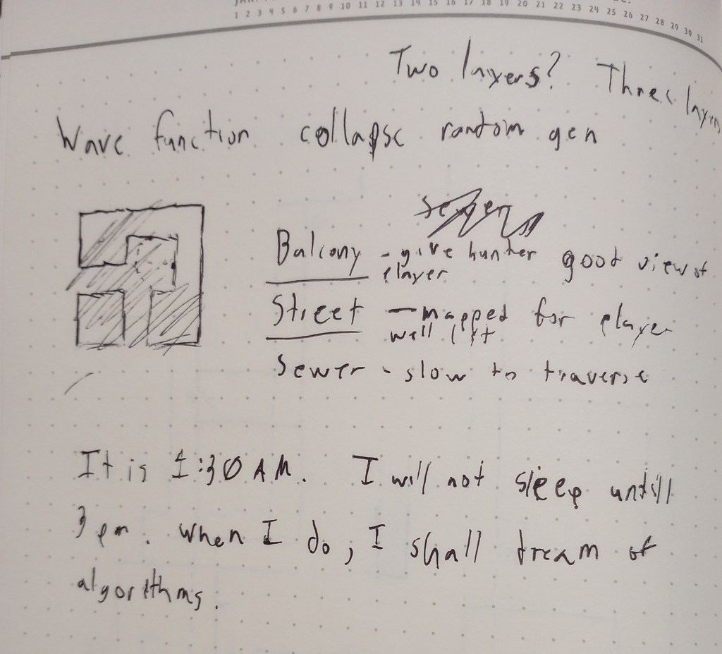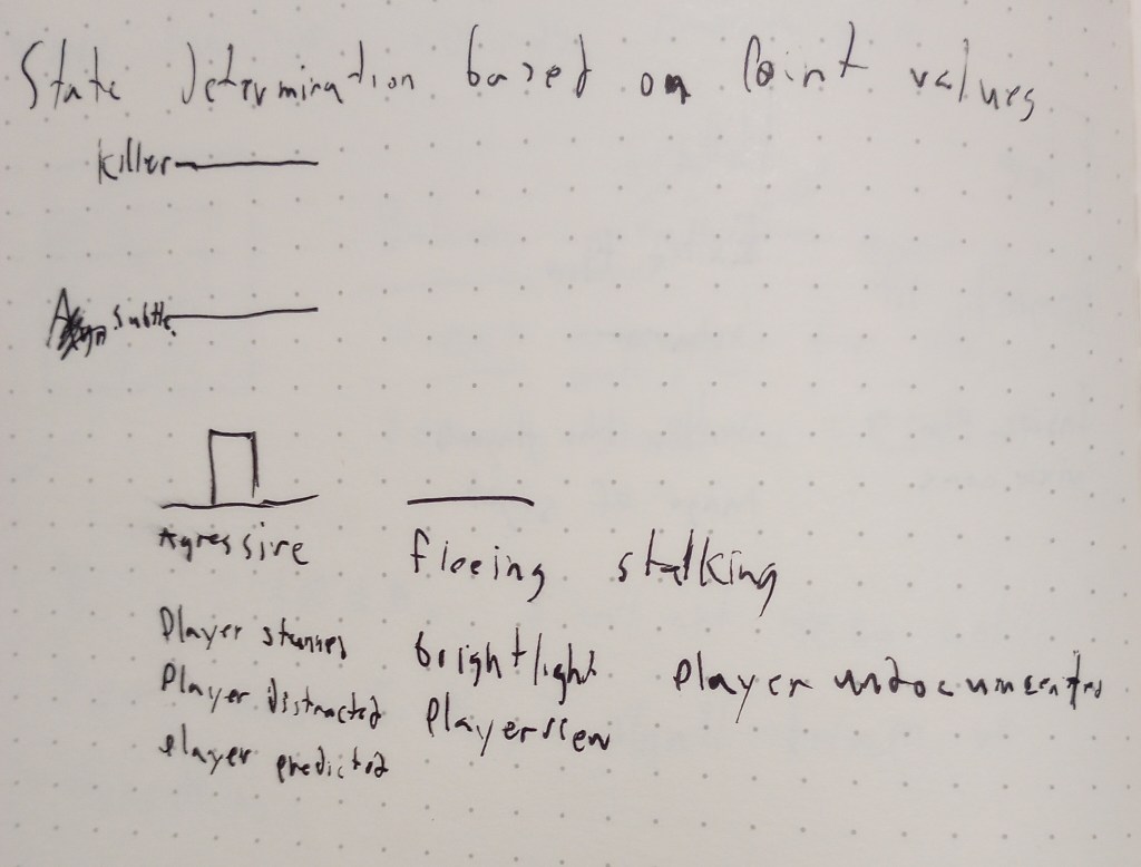 This is the first prototype video I thought to take, and the only one that exists for this area. However, it does showcase how the environmental design impacts the overall gameplay, even in this early stage. The fact that the lighting hides and reveals the hunter exemplifies the power that lighting has in this genre, and how it can be used to the advantage of the AI.